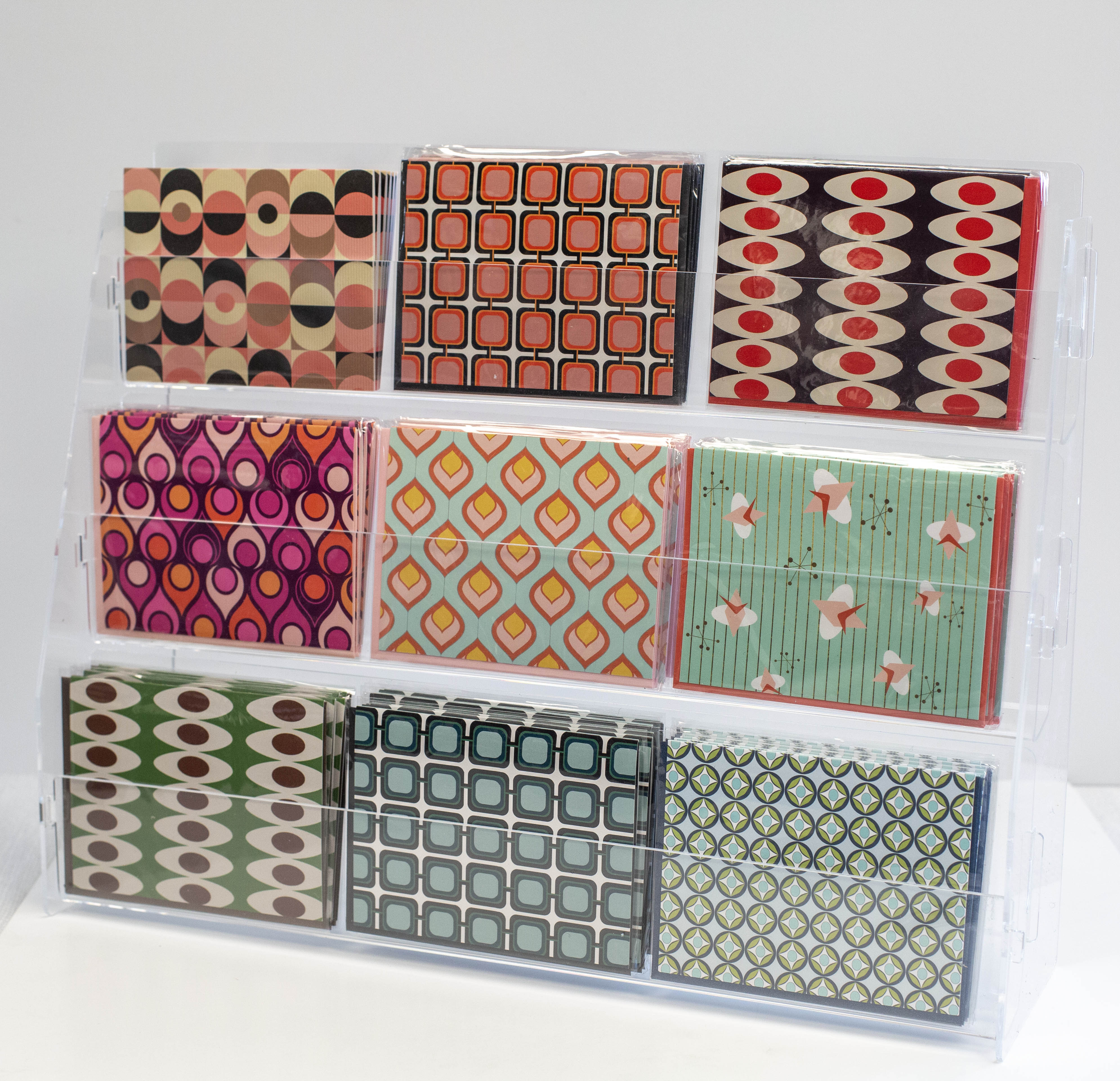 This display has been hand selected to properly display the Mod Lounge Paper Company product line. The acrylic display perfectly depicts the popular lucite and acrylic used in Mid Century Modern design, while showing off the nostalgic product with out any visual barriers. Easy assembly.