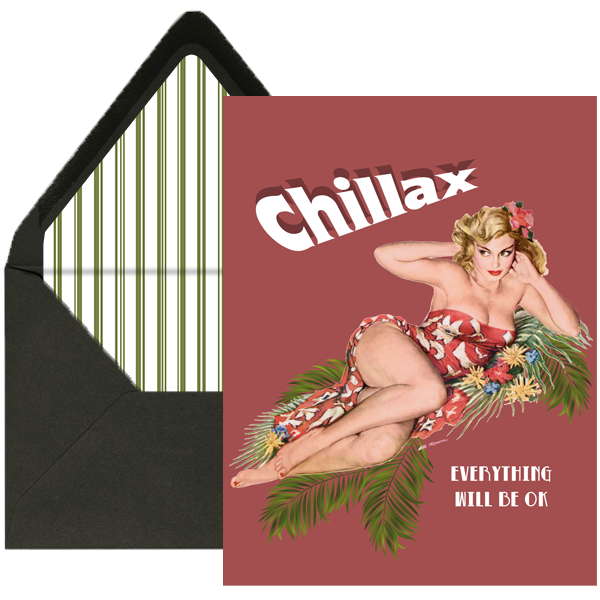 Sometimes you need a reminder that everything will be ok. This vintage inspired pinup combines with trendy Chillax saying. With coordinating liner, the recipient will cherish this keepsake card. Blank inside to write your own sentiments.