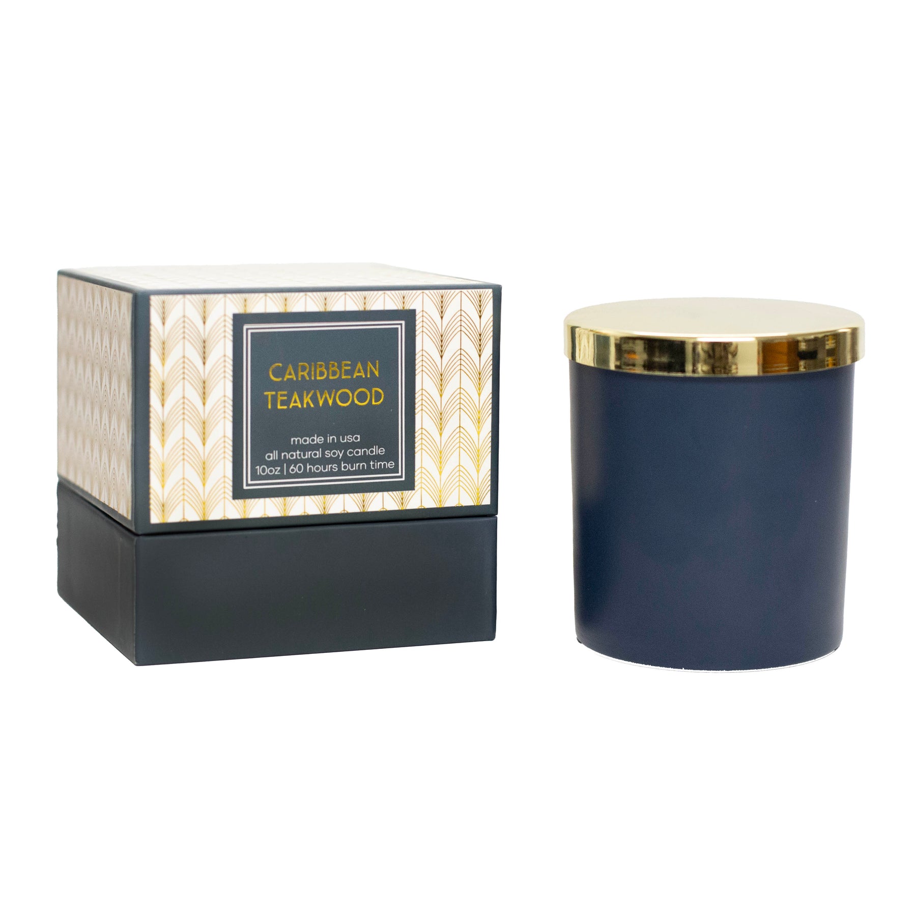 Indulge in the luxurious and exotic scent of Caribbean Teakwood with our Blue Mid Century Modern Boxed Candle. The blue matte jar with gold glimmer inside and lid adds a touch of elegance to any room or workspace, while the gold pressed foil mid century modern design on the box makes it a stunning gift or chic decor. The two part box with foam insert ensures safe delivery.