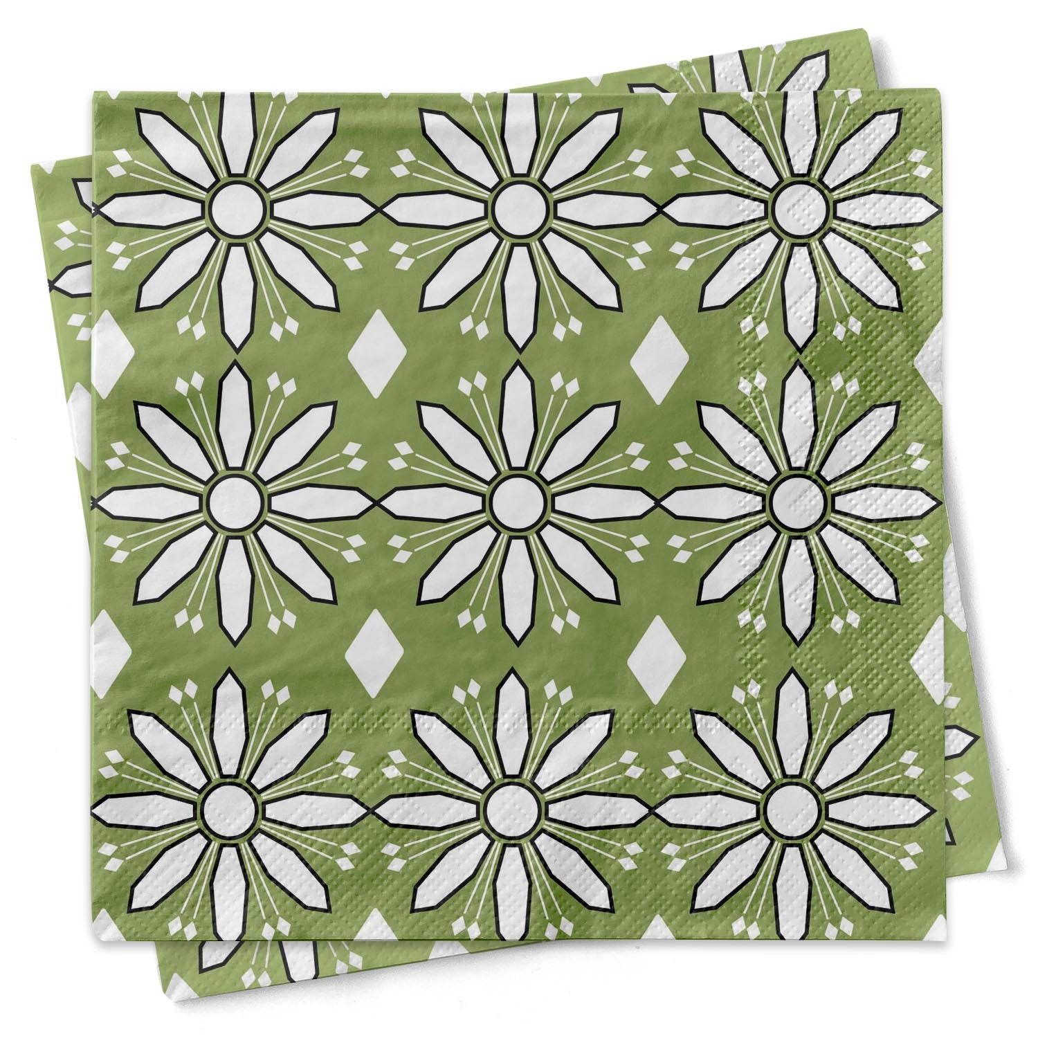 Green and White Mid Century Modern Flower Cocktail Napkin