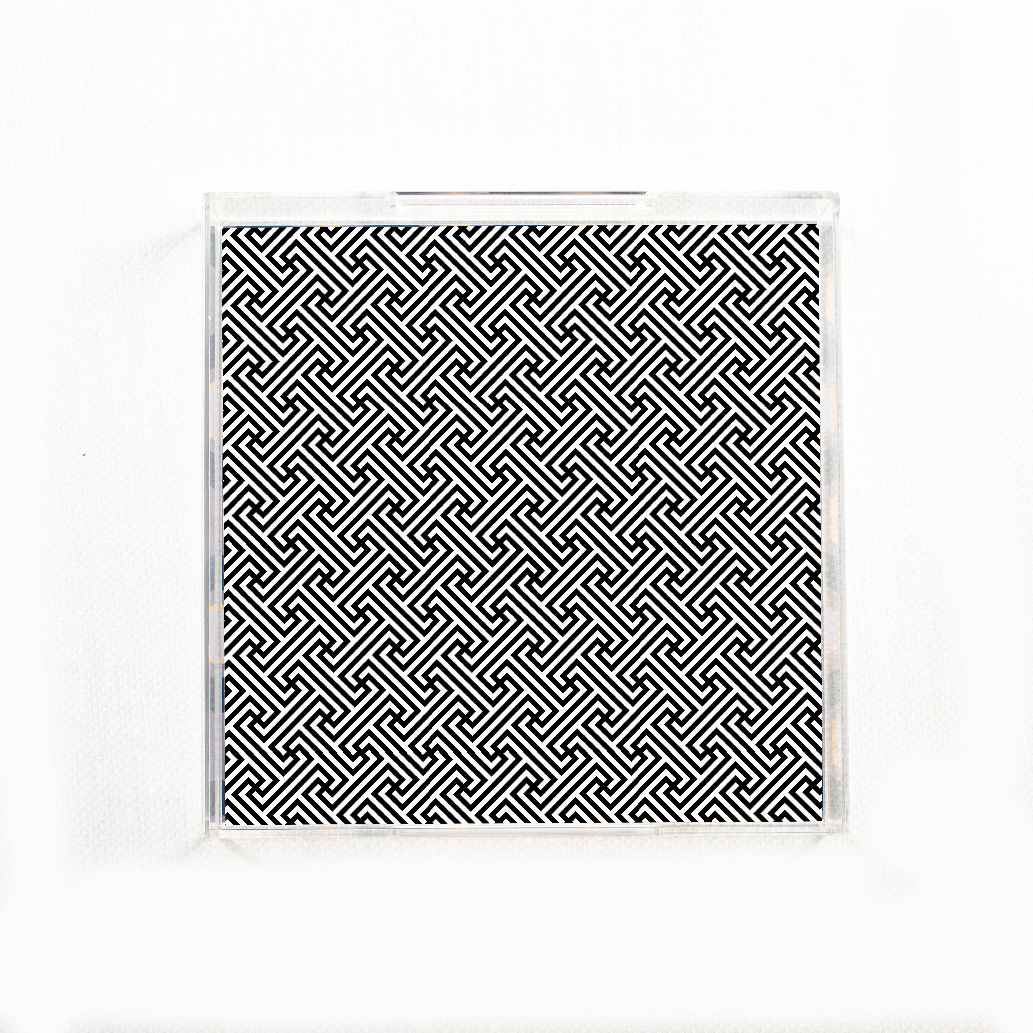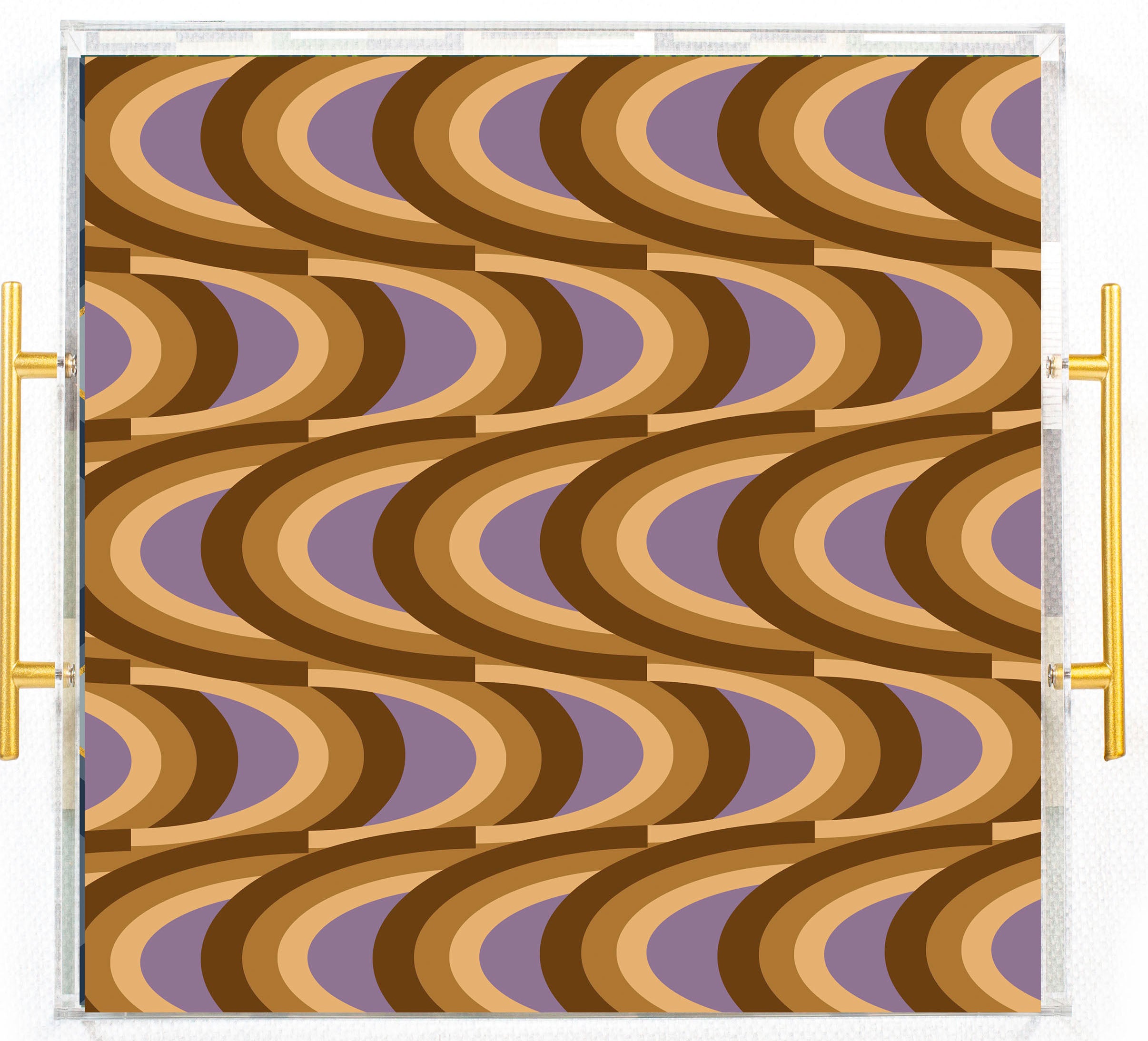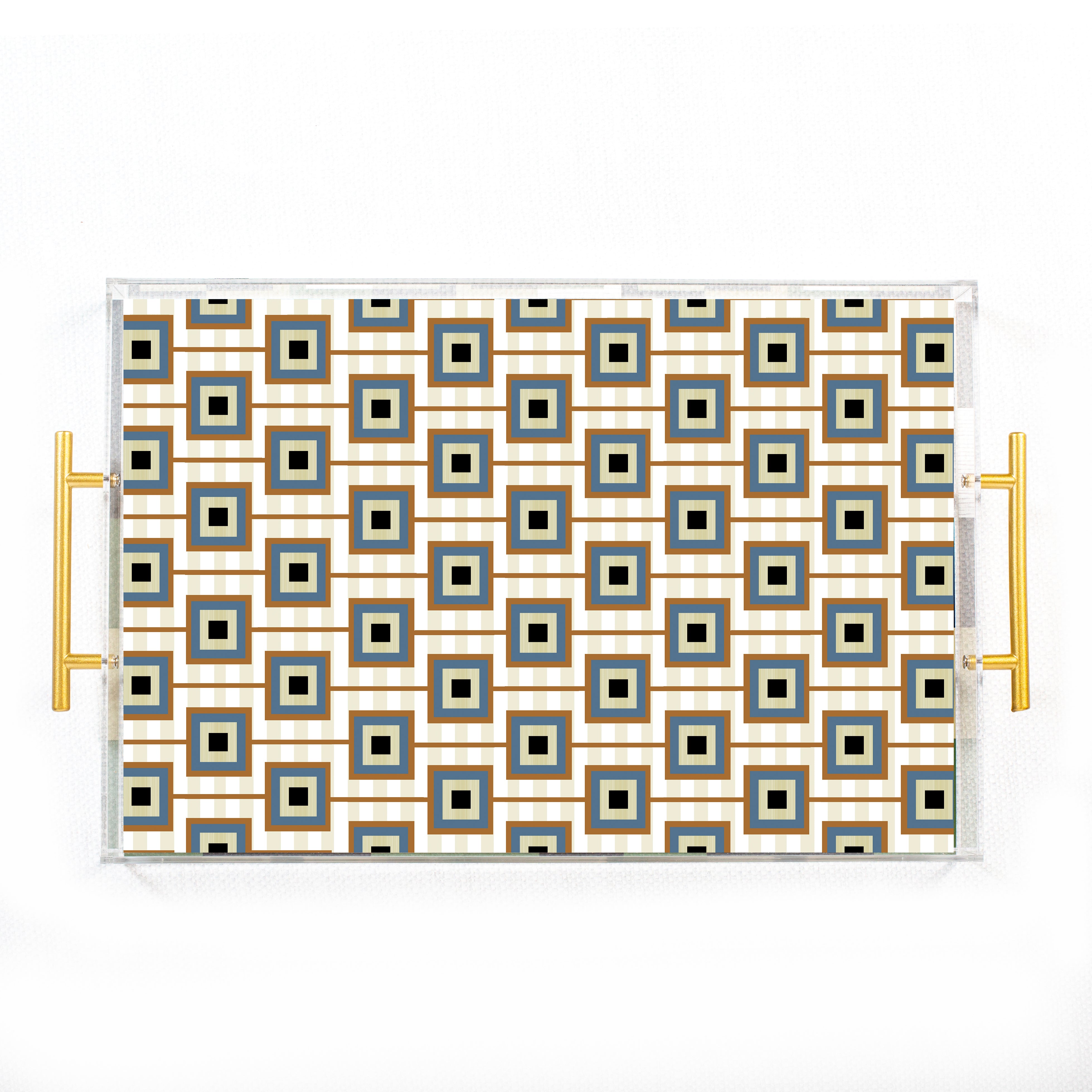 Mid Century Modern sturdy acrylic tray with digitally printed matte surface. Indoor or outdoor use. Ample room for serving cocktails poolside, or a conversational piece on a coffee table. 11x11 Square with cut out handles or 12x18 Rectangle tray with matte gold handles