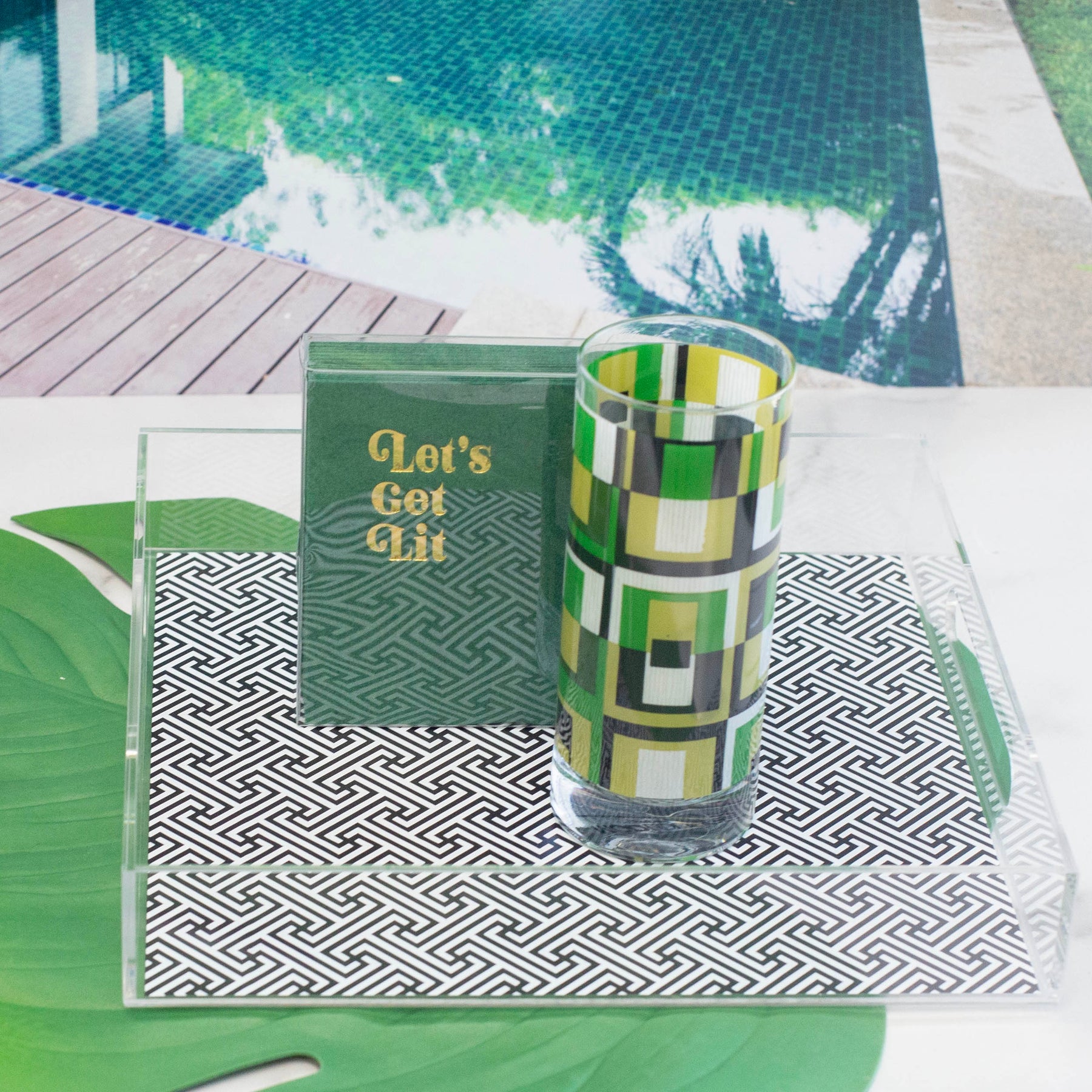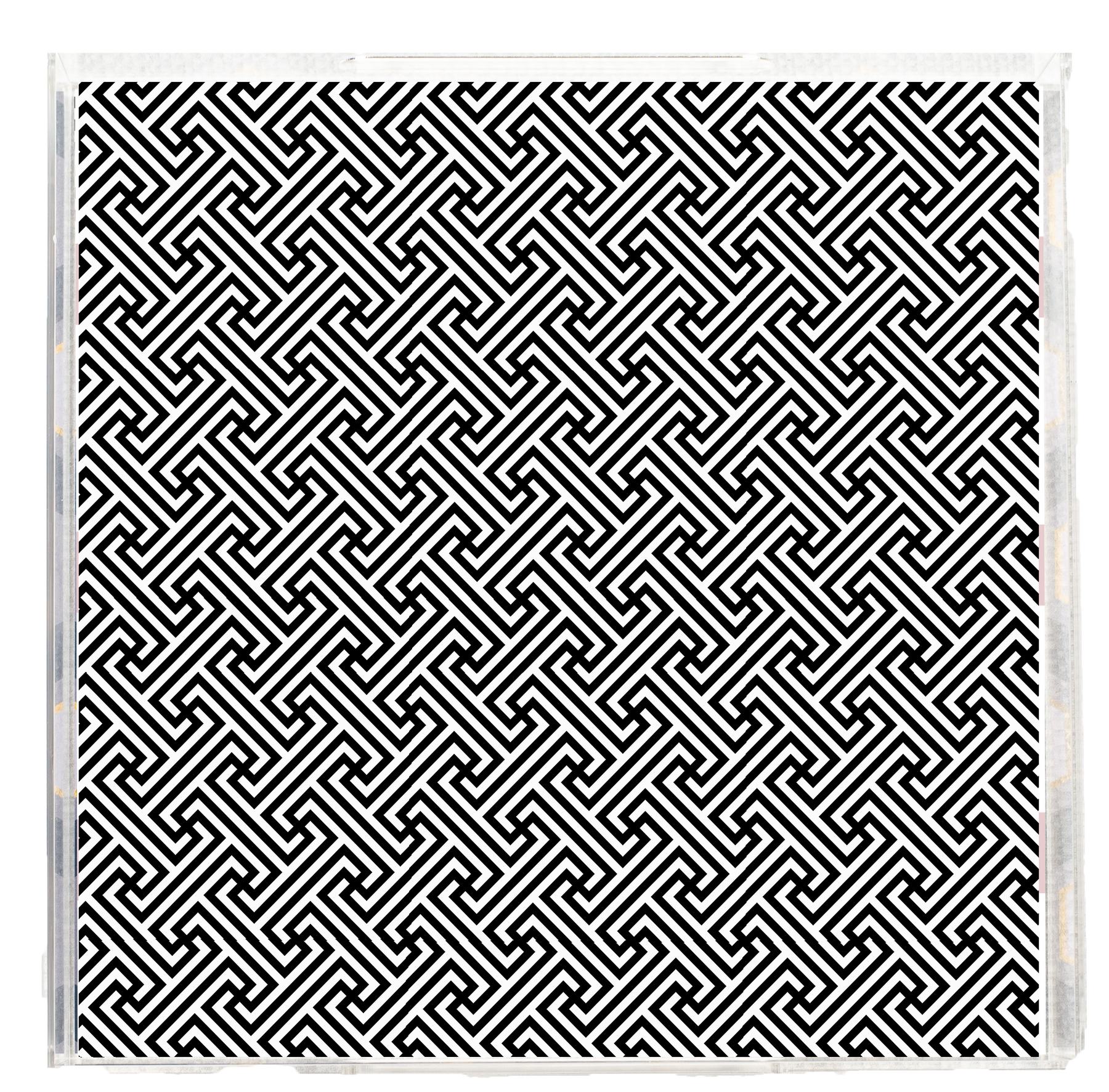 Give your customers an easy way to style the bar cart. Our square acrylic serving tray features a bold black-and-white mid-century maze pattern that plays beautifully with modern and retro décor alike. Lightweight yet sturdy, it’s perfect for corralling cocktail glasses, napkins, swizzle sticks, and a candle for instant “giftable bar” displays. Clear sides keep the pattern crisp while handles make it easy to carry from kitchen to living room.