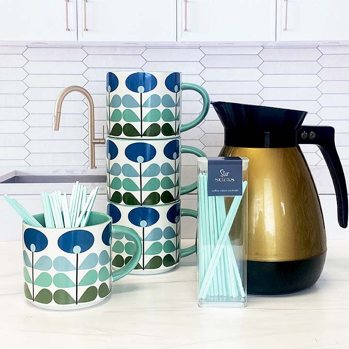 Each stirrer is crafted from durable, food-safe acrylic in an iconic retro aqua blue hue that pairs effortlessly with mugs, espresso machines, and curated countertop setups. At 5.5 inches tall, they’re perfectly sized for coffee, tea, cocoa, and cocktails.